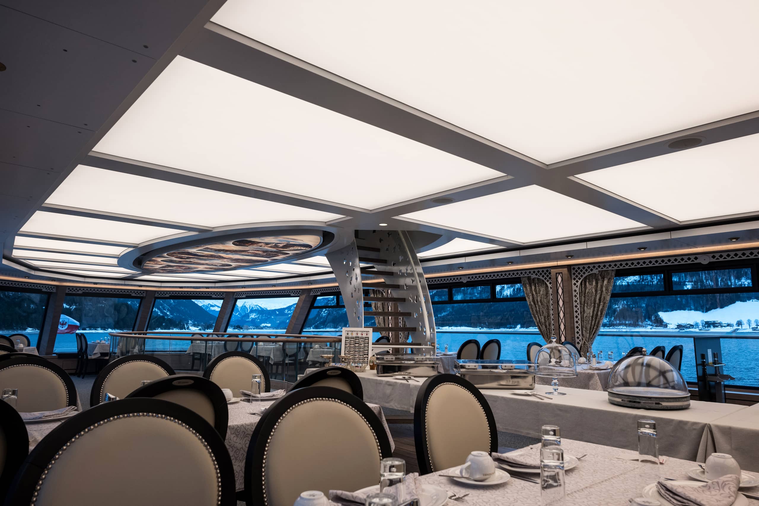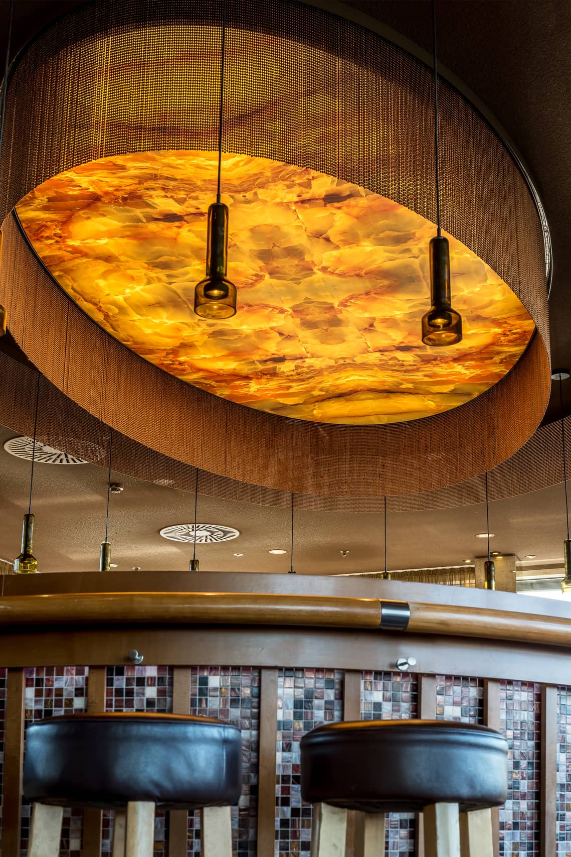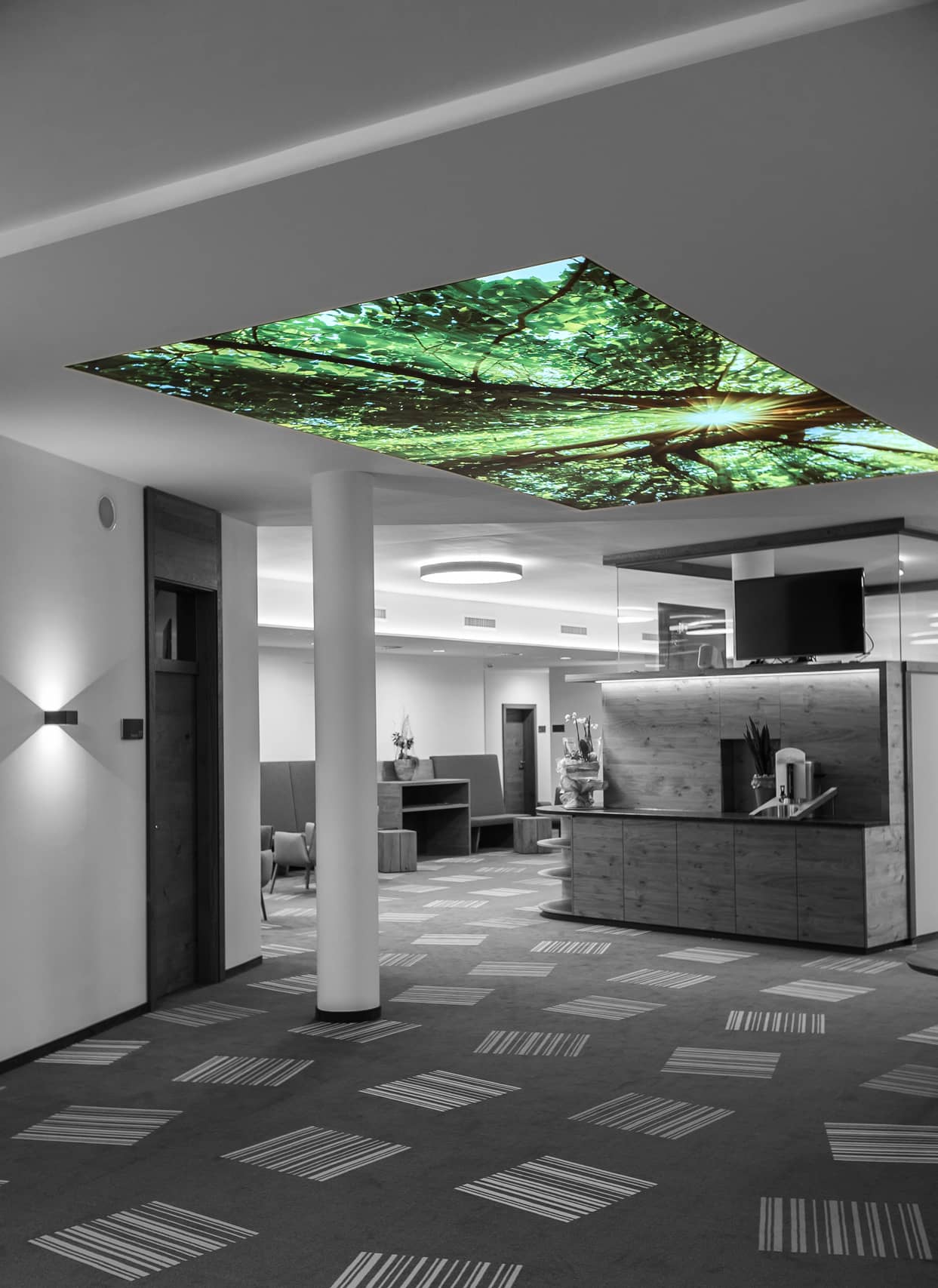 Ob Empfangsbereich, Retailfläche, Gastronomie, Wellness oder private Architektur: Die Decke wird zur gestaltenden Fläche. Nahtlos integrierbar in bestehende Lichtkonzepte, dabei immer ein eigenständiges architektonisches Statement. Formate, Größen und Anwendungen bleiben offen – die Wirkung klar.
