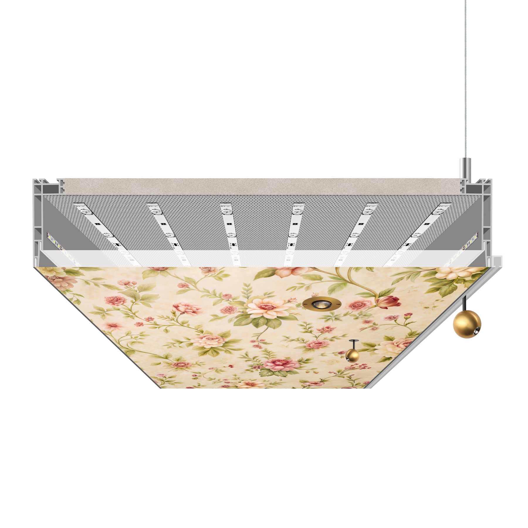 Die textile Bespannung wird spannungsfrei und sauber integriert und kann bei Bedarf jederzeit gewechselt werden. So bleibt die Decke dauerhaft wandelbar – technisch stabil, gestalterisch flexibel und langfristig wartungsfreundlich.